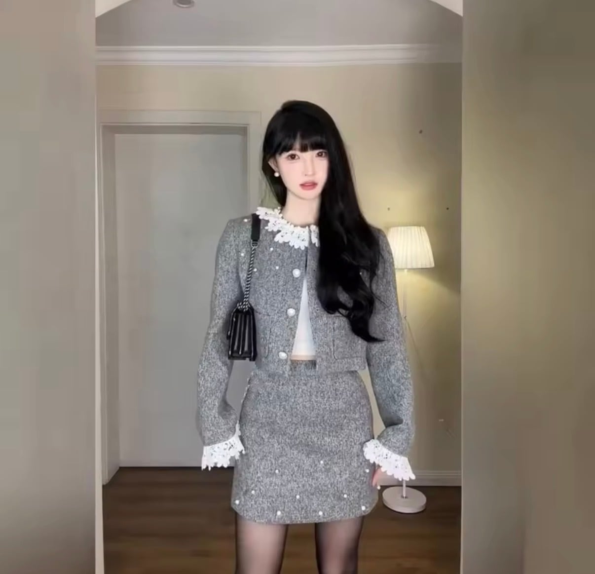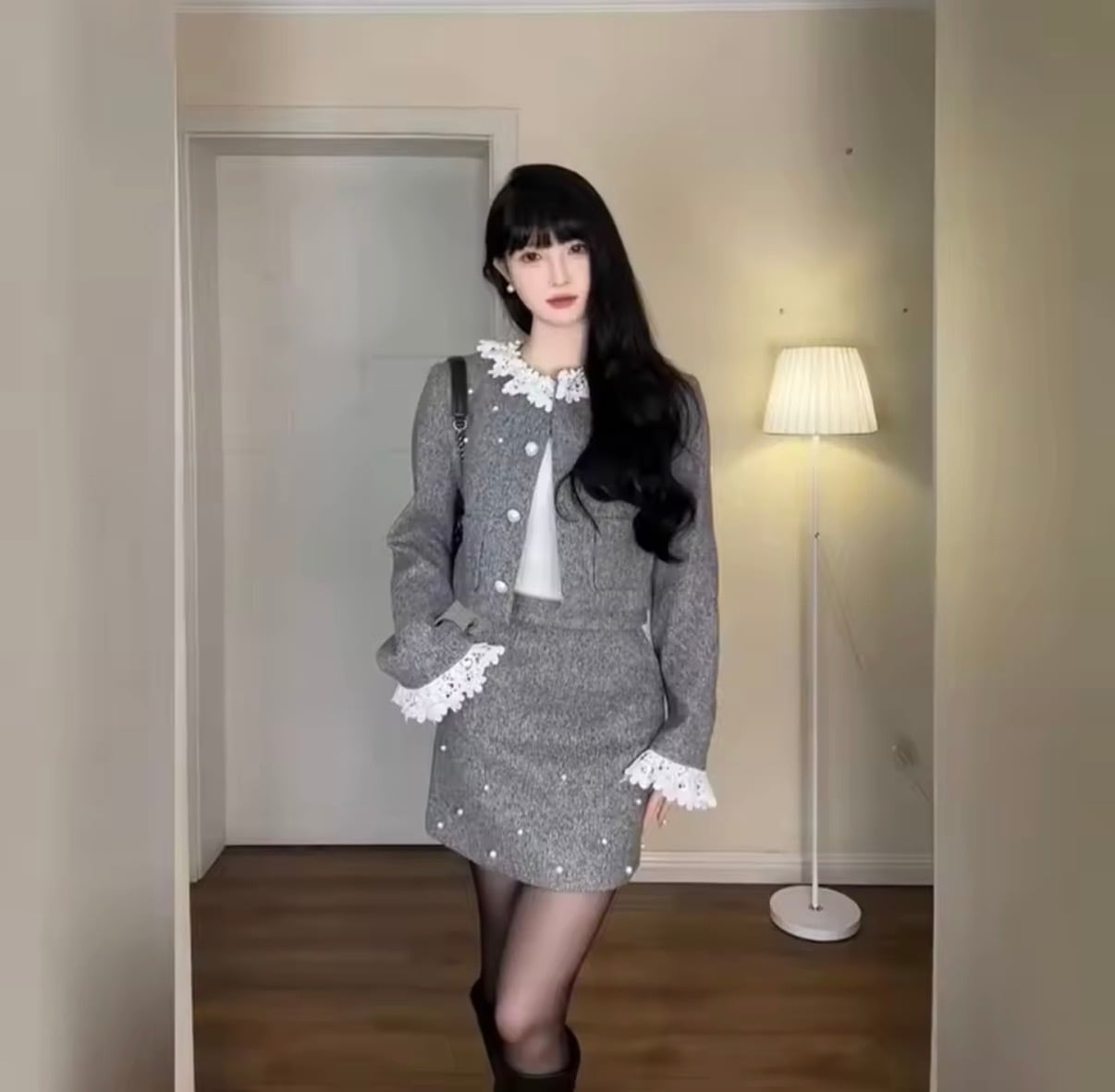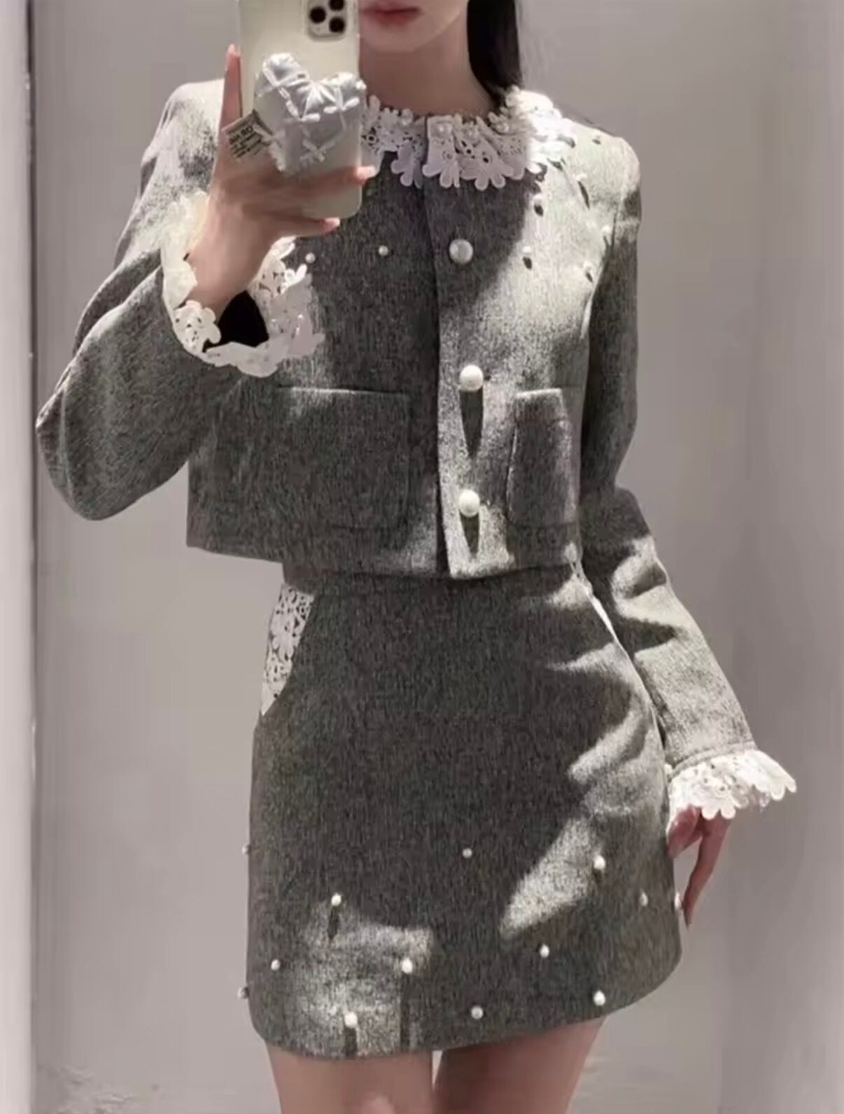 フリルとパール装飾が特徴のグレーのニット風セットアップ。
