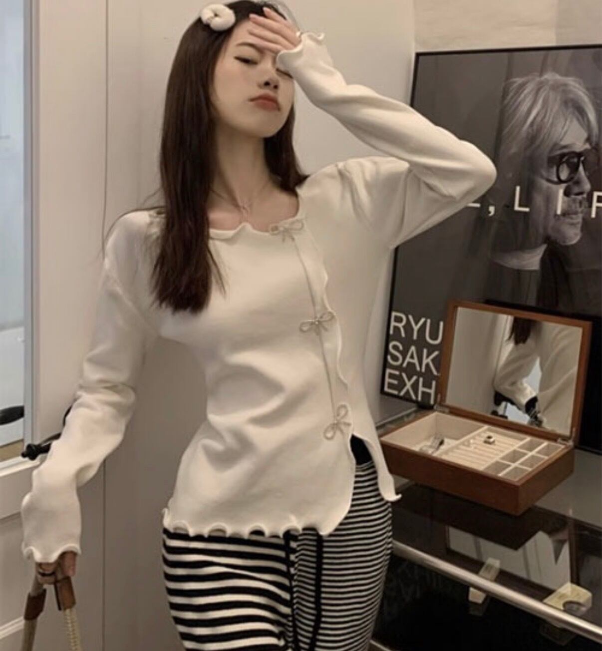 アシンメトリー メロウ ストーンリボン ニット カットソー トップス