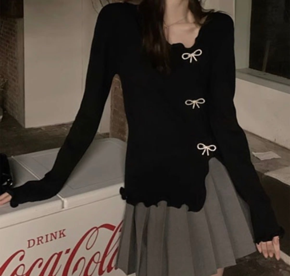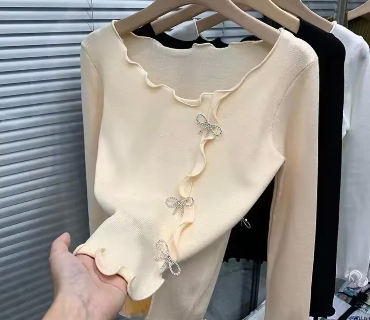 キュートなキラキラリボンデザイン、アシンメトリーなデザインが可愛いニットトップスです。