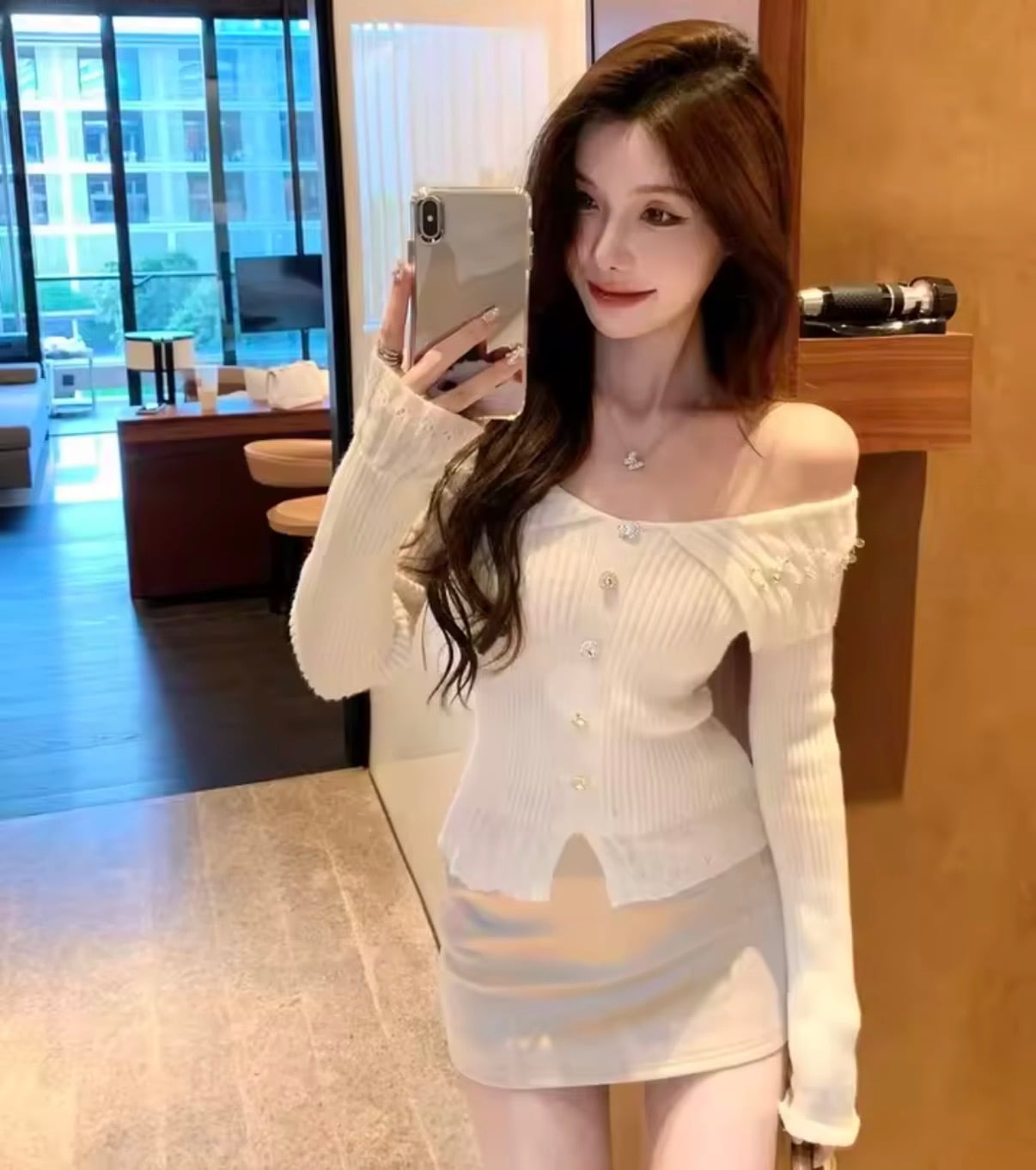 女性らしさを引き立てるオフショルダービジューデザインニットトップスです。