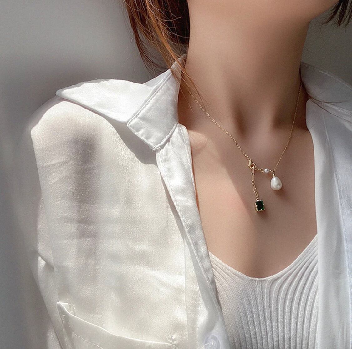 3way ジルコンストーンエメラルド×パール ネックレス ギフトジェム