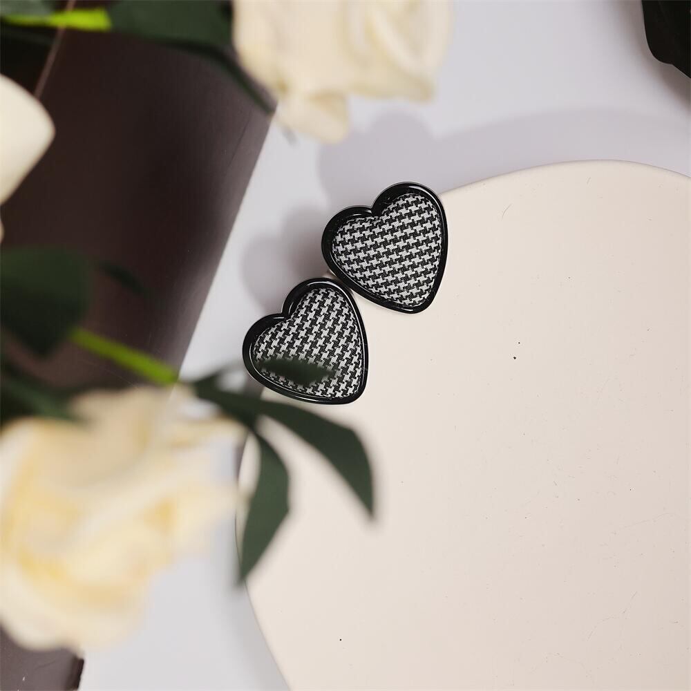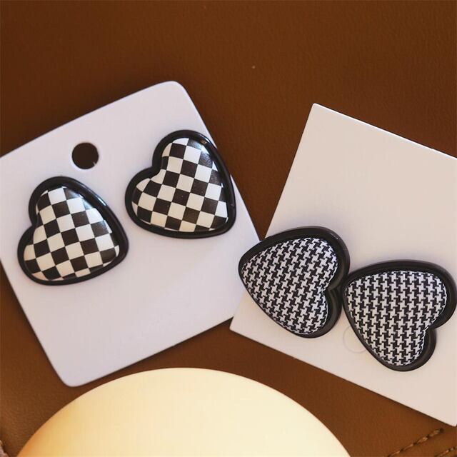 ハートレトロ ビックピアス チェック千鳥柄 イヤリング シルバー 韓国
