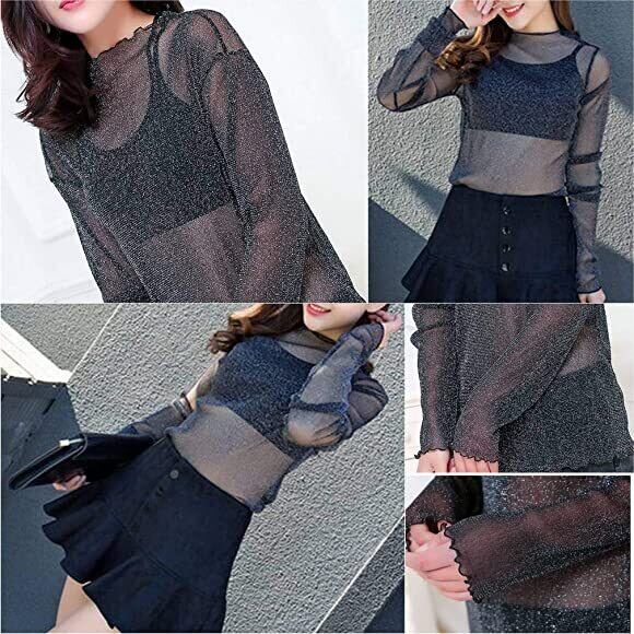 スキントップス シースルーラメメッシュトップス インナーハイネックメッシュ